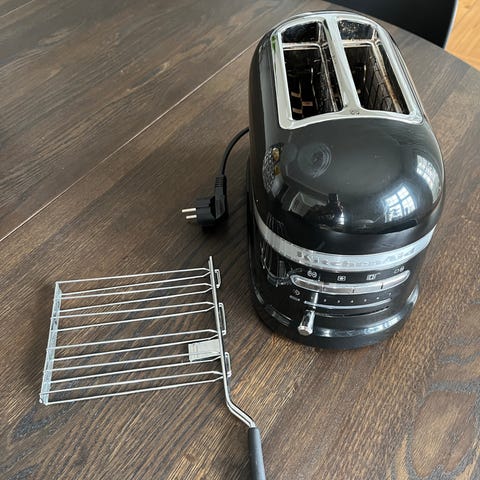 KitchenAid brødrister i sort. Modellen har to risteslots og mekanisk betjening på fronten. Kabinettet er i lakeret metal/plast med kromdetaljer. På billederne ses også en tilhørende rist/holder til brød eller boller. Velegnet til almindelig ristet brød og optøning/ristning af frosset brød afhængigt af indstillingerne på maskinen. Incl toast holder. Indstillingsknap til hvor længe der skal ristes er knækket af. Jeg er oplyst af Imerco at reserdel kan købes. Derfor er prisen sat lavt. Nypris 2700kr