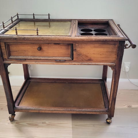 Sammenklappeligt serveringsbord med aftagelig bakke i brunlakeret træ. Bordet har krydsben, der kan foldes sammen for nem opbevaring. Bakken har høje kanter og udskårne håndtag i siderne, så den er let at løfte og bære. Velegnet som sidebord, barbord eller serveringsbord i stue, køkken eller spisestue.