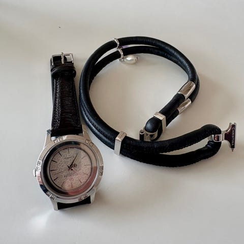 Læder armbånd og ur fra CHRISTINA watches. Armbåndet måler 46 cm, og der medfølger 5 stk charms i sølv. Uret mangler dog batteri.