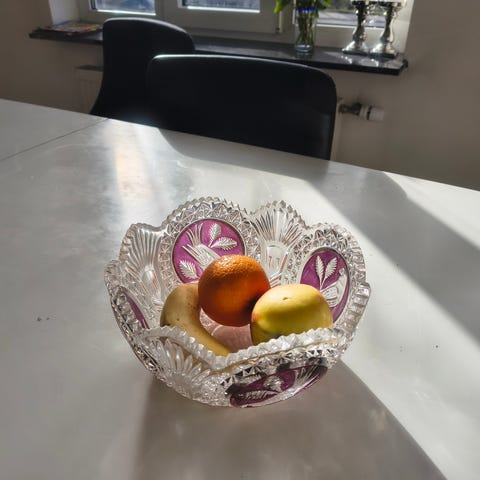 Skålen har bølget kant og dybt slebne felter på både sider og bund. Egnet til servering af frugt, snacks eller som dekorativ skål/solfanger i hjemmet.