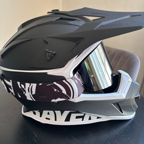 Arai MX hjelm i rød, blå og sort farvekombination. Hjelmen er en fuld-face motocross/offroad model med lang skygge og stor åbning til motocrossbriller. Indersiden har polstring omkring kinder og hoved for bedre pasform og komfort. Velegnet til motocross, enduro eller anden offroad kørsel, hvor der ønskes en åben front med plads til briller.
