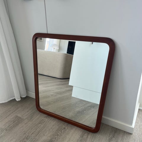 Et ret stort teaktræs vægspejl. Ikke så tit jeg har dem så store. Tyk velholdt ramme.