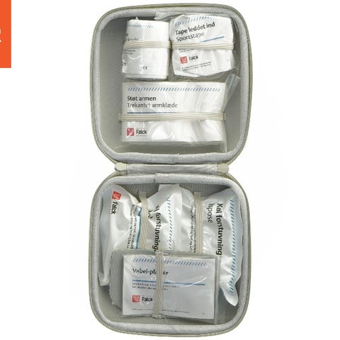 Falck mobil nødhjælpskuffert førstehjælpskasse i orange plast. Kufferten har bærehåndtag og indvendig inddeling med rum og gennemsigtig plastklap til organisering af førstehjælpsudstyr. Indeholder forskellige typer forbindinger, kompresser, plastre og øvrigt basis førstehjælpsmateriale, egnet til brug i fx bil, arbejdsplads eller hjem, hvor der er behov for en transportabel førstehjælpsløsning.