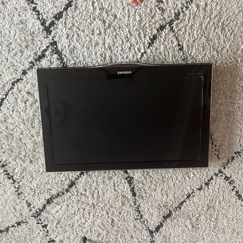 Samsung fladskærms-tv. Tv’et har indbygget tuner og forskellige tilslutningsmuligheder på bagsiden, herunder stik til antenne og andre eksterne enheder. Velegnet som hoved-tv i stuen eller som ekstra tv i et andet rum. Fjernbetjening ses på billederne.