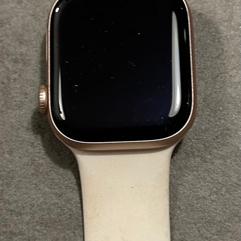 Apple smartwatch med rektangulær skærm og unisex design. Uret har lys rem i silikone med justerbar lukning. Medfølgende magnetisk opladerkabel ses på billederne. Velegnet til daglig brug som aktivitets- og notifikationsur for både mænd og kvinder.