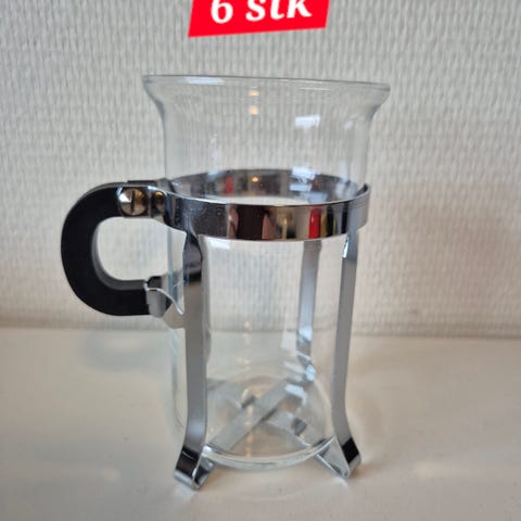 Bodum glas krus med metalholder. Sættet består af flere glas med transparent glasindsats og ydre holder i metal med hank. Krusene er egnede til varme drikke som kaffe, te eller lignende og kan bruges i køkkenet eller ved borddækning.
