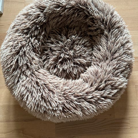 Dejlig donut til mindre hund. Fluffy Beige fra Maxi Zoo. Diameter 60 cm. Som ny. Vores hund ville ikke ligge i den. Vaskbart betræk. Nypris 269,- kr.