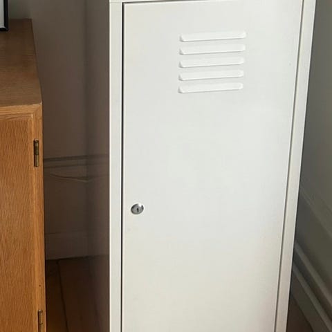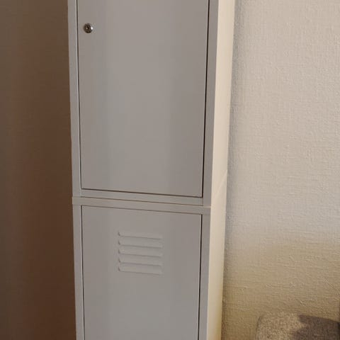 Det gamle PS skab fra IKEA i metal sælges… Der er limet mørkebrune lædergreb med messingknopper på for at give det et lidt andet udseende.
