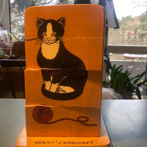Der er motiv af en kat på den ene side og en hane på den anden side
