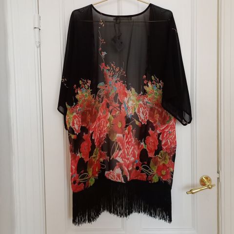 Nü kjole/kimono i størrelse M. Kjolen er fremstillet i viscose,- lange ærmer med mørke strik manchetter,-gennemknappet. Længde 114 cm.