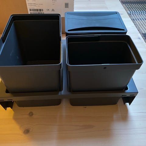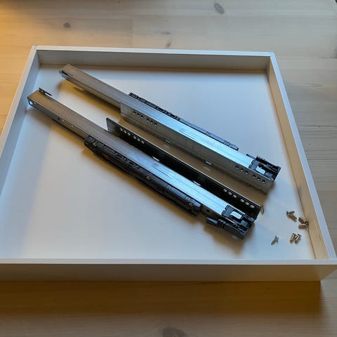 Reform skuffe i hvid metal. Skuffen leveres med to metalskinner af bedste kvalitet og tilhørende beslag/skruer som vist. Skuffen er kort (dybde 30) og passer ved håndvasken. Nypris 1500. Kan leveres i Kbh og omegn.
