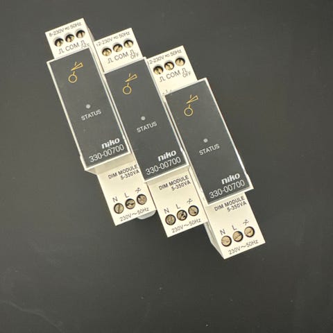 Niko 330-00700 RCL lysdæmper til montering på DIN-skinne. Enheden er trykknapstyret og har skrueterminaler til tilslutning. Belastning 5-350 W, egnet til glødelamper, halogen og lavvolt elektroniske transformatorer afhængigt af installation. Velegnet til indbygning i tavler og styringssystemer, hvor der ønskes regulering af lysniveau via trykknap.