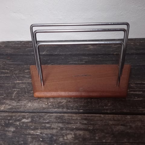 Særdeles sjælden, elegant retro brevholder udført i teaktræ. Dekoreret med raffinerede messing detaljer, en lille skuffe i den nederste del, foret med rød, blød velourlignende stof indeni. Brugt pæn stand. Mange anvendelsesmuligheder. Mål: 26,5 x 10 x 18 cm.