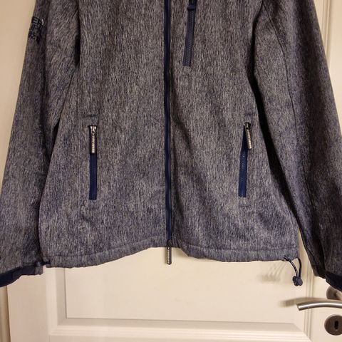 Flot jakke i sort/hvidt/lysgråt vævning (uld/polyester), blåt foer (viskose/bomuld), mange indvendige og udvendige lommer, elegant snit.