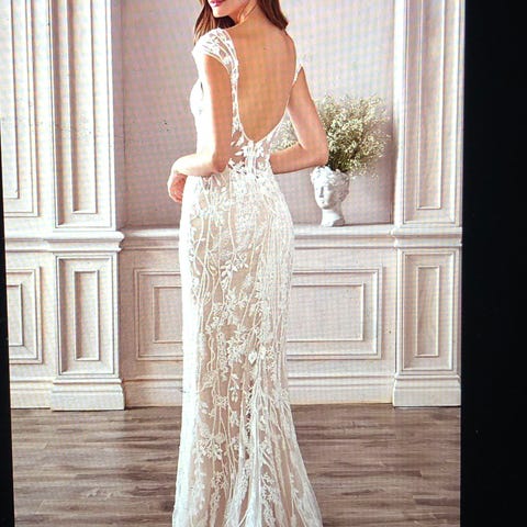 Kjolen er perfekt som brudekjole til dig som ønsker et romantisk og elegant look. Den har en smuk figursyet bustier-overdel, dyb rund ryg med fine knapper og en fyldig nederdel med slæb, som giver et virkelig smukt og feminint udtryk.