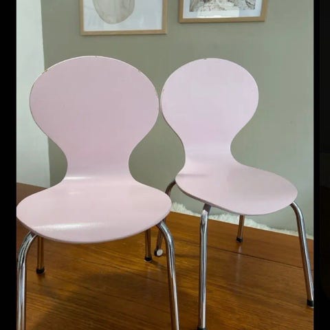 3 børne skal-stole i friske pastel farver sælges.