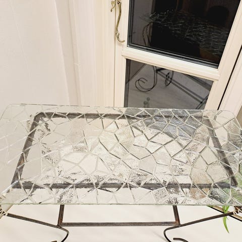 Herligt vintage mormorbord, i jern med original og intakt glasplade, med buede ben, velegnet som entr’e stue eller terrassebord