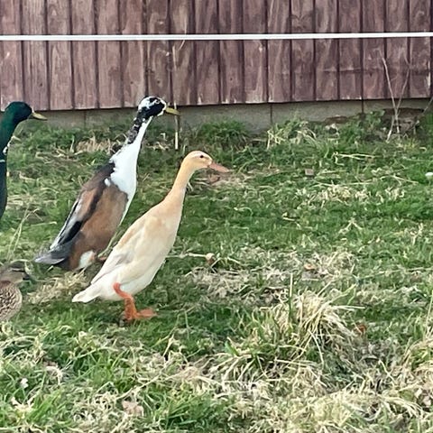 Ænderne er fra sidste år og ca. 9 måneder gamle. De er sunde, aktive og vant til at gå frit sammen med Brahma-høns samt gæs. De trives godt i flok og er rolige i omgang.