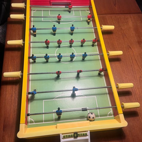 Bordfodboldbord i nogenlunde stand. Lidt vakkelvornt. Bold medfølger ikke.