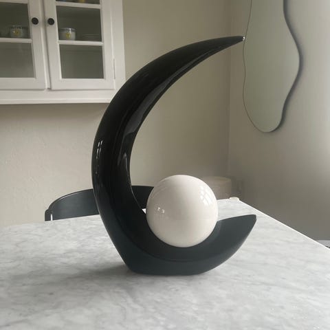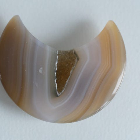 Denne måne er så smuk med de fine tegninger den har, og de små krystaller inde i grotten. Den har en ujævnhed på bagsiden, måske en flis der er slået af. Prisen er sat efter det.