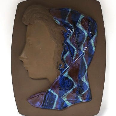 Johannes Hedegaard vægrelief i keramik. Motivet er et profileret hoved af en person med farvet, glaseret hovedbeklædning i blå, brun og sorte nuancer på mat, lys brun baggrund. Bagsiden er mærket med Royal Copenhagen-stempel?.., modelnummer 2798 samt kunstnerens signatur Johannes Hedegaard. Vægrelieffet har indhak på bagsiden til ophængning på væg.