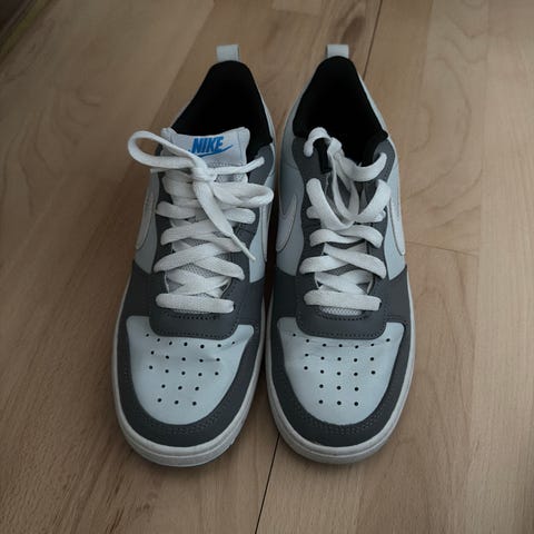 Nike sneakers i str. 44. Lav model i hvid og navy med snørelukning. Overdel i læder med perforeret tåparti og klassisk Nike-logo på sider og hæl. Ydersål i gummi med mønster for greb. Velegnet som hverdagssko og fritidssko.