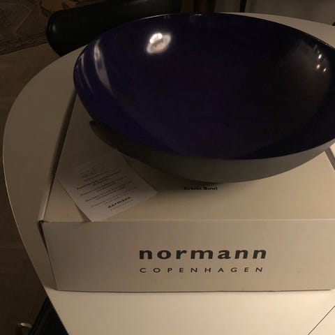 Normann Copenhagen Krenit skål med en diameter på ca. 25 cm. Skålen har grå inderside og mørk yderside. Velegnet til servering af salater, frugt eller som dekorationsskål i køkken eller stue. Leveres i original Normann Copenhagen æske som vist på billederne.