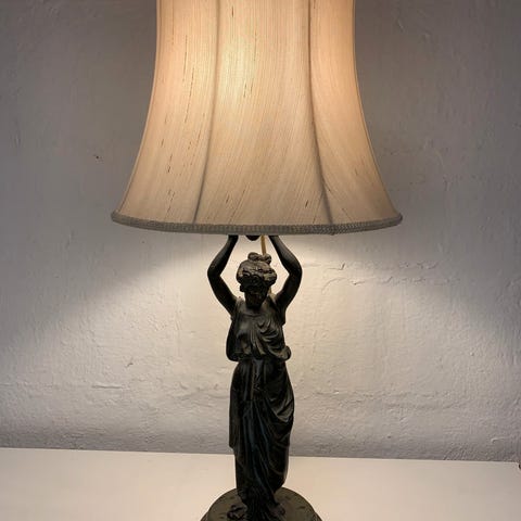 Bordlampe med fod og stander i marmor og messing samt klassisk stofskærm. Lampen har detaljeret fod i messing og marmoreret midterstykke med flere farvenuancer. Stofskærmen er lys med dekorativ bort langs kanten. Velegnet som bord- eller læselampe i stue, soveværelse eller entré. Højde uden skærm 55cm