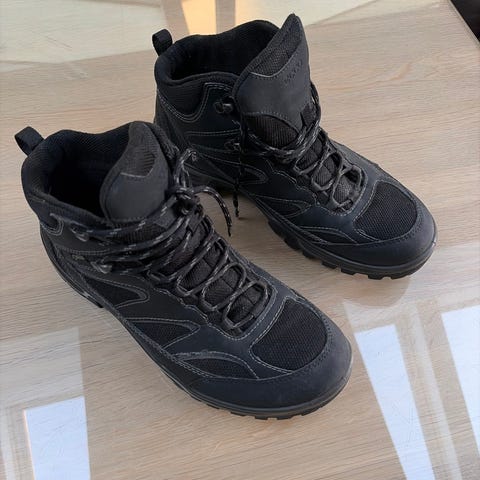 Ecco støvler i str. 41. Støvlerne er brunlige med snørelukning og kraftig gummisål med mønster, der giver godt fodfæste. Overdelen fremstår i et robust materiale, velegnet til hverdagsbrug og udendørsaktiviteter. Indersiden har polstret kant ved anklen for øget komfort. Velegnet som praktiske fritids- eller vandrestøvler.