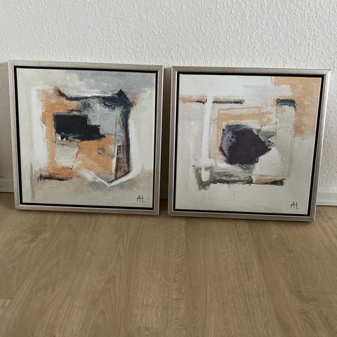 Sæt med to abstrakte malerier i kvadratisk format. Motiverne har varme nuancer af orange, gul, beige og hvid med enkelte sorte markeringer. Begge billeder er indrammet i enkle, sorte rammer og er velegnede som vægdekoration i stue, kontor eller andre opholdsrum. Kan hænges samlet som et sæt eller hver for sig for at skabe en sammenhængende billedvæg.