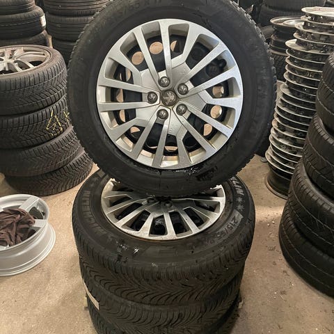 Alufælge, 17", originale Peugeot fælge, 225/ 60 / R17, krydsmål 5 x 108, vinterdæk (2 trænger udskiftning, 2 har 1-2 sæsoner mere). Continental WinterContact TS8709 dæk.