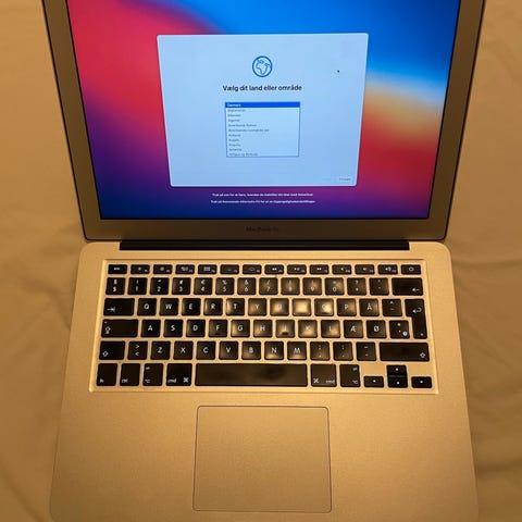 Apple MacBook Air 13" bærbar computer i sølv. Modellen på billederne viser en 13" MacBook Air (mid 2013) med macOS Big Sur installeret. Skærmstørrelsen er 13 tommer, og kabinettet er i sølvfarvet aluminium. Tastaturet er sort med lys grå ramme. Der medfølger en Apple strømforsyning/lader, som ses på billederne. Egnede anvendelser omfatter almindeligt kontorarbejde, internetbrug og studier, afhængigt af den konkrete konfiguration af processor, hukommelse og lager i den viste model.
