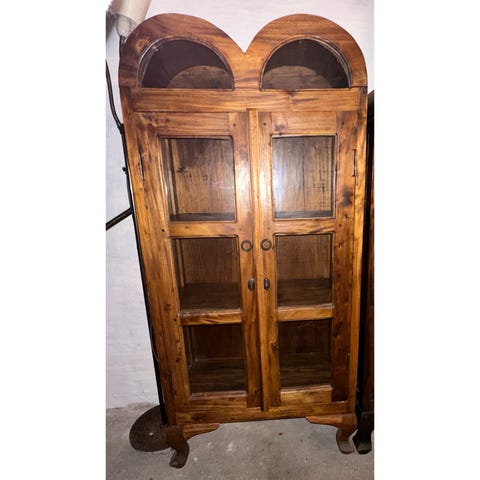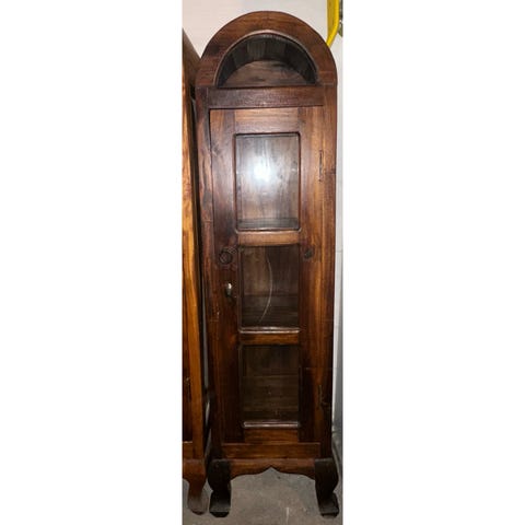 Vitrineskab i træ med glaslåge på fronten. Indvendigt er der flere hylder til opbevaring eller udstilling af genstande. Nederst har skabet to skuffer med metalgreb, som giver ekstra opbevaringsplads til mindre ting. Skabet egner sig til fx service, pyntegenstande eller andre ting, der ønskes opbevaret synligt bag glas.