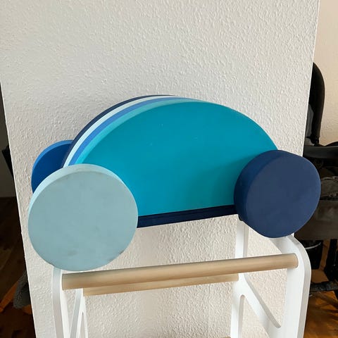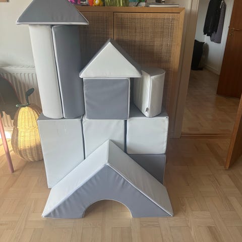 Sæt med skumlegeklodser formet som dyr og en rund tromme. Sættet består af en blå elefant i to dele, en lilla krokodille eller lignende figur samt en rund tromme med panda-motiv i grå, gul og mørkegrå striber. Delene er fremstillet i blødt skum, der egner sig til leg på gulv, siddemøblering eller balance- og motoriklege for børn. Farverne er afdæmpede i nuancer af blå, lilla, grå og gul. Sættet kan bruges samlet eller hver del for sig som legeelementer på børneværelse, i stue eller legerum.