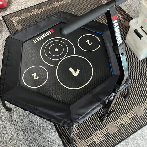 Salta fitness trampolin med håndtag i sort og orange. Sekskantet trampolin med elastikker langs kanten og springdug med Salta-logo. Udstyret med lodret håndtag/støttestang foran, som kan give ekstra støtte under træning. Egnet til indendørs brug til fitness og konditionstræning for både børn og voksne, afhængigt af vægtbegrænsning angivet af producenten. Ramme og ben er i metal med plastfødder, og hoppefladen er i syntetisk materiale.