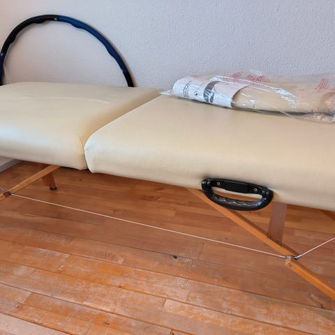 Massagebriks i sammenklappeligt design med polstret liggeflade. Overfladen fremstår i blå kunstlæder, som er let at tørre af. Briksen har metalstel og medfølgende hovedpude. Velegnet til massage, behandling eller undersøgelse i klinik eller hjemmebrug, og kan klappes sammen for lettere opbevaring og transport.