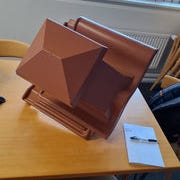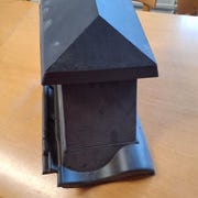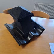 Produktet er sort, geometrisk med en skarp form og glat overflade. Det ser ud til at være lavet af plast.