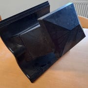 Produktet har en geometrisk form, der består af en kvadratisk blok og en skrå overflade. Det er lavet af sort plast eller et lignende materiale, som giver det et moderne udseende. Overfladen fremstår glat med en mat finish. Der er også en rød label påført.