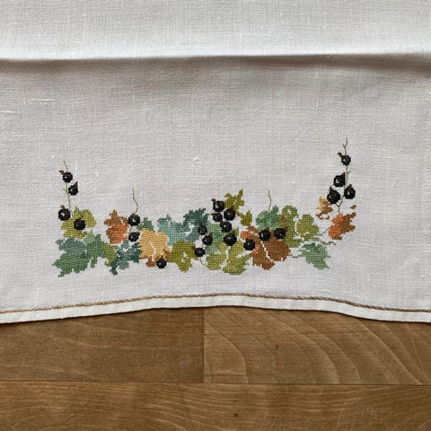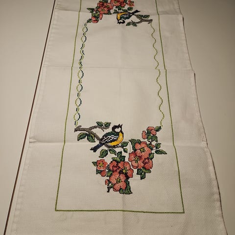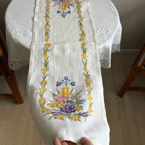 Super smuk håndbroderet bordløber med de fineste liljekonvaller. Nyvasket & i flot stand. Måler 22 x 108 cm.