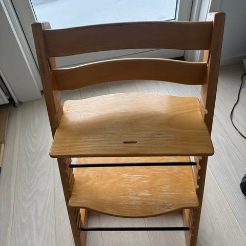 Stokke højstol i hvidmalet træ. Klassisk model med justerbar siddeplade og fodplade, som kan tilpasses barnets højde. Malingen har synlige brugsspor og afskalninger flere steder, som ses på billederne. Intet galt med funktionaliteten.