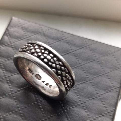 Smuk ring, enkel og stilren. Den er brugt så den har lidt brugsspor. Det kan en guldsmed sikkert pudse op og så har man en ring der er som ny. Størrelse 50-51, den dækker begge størrelser