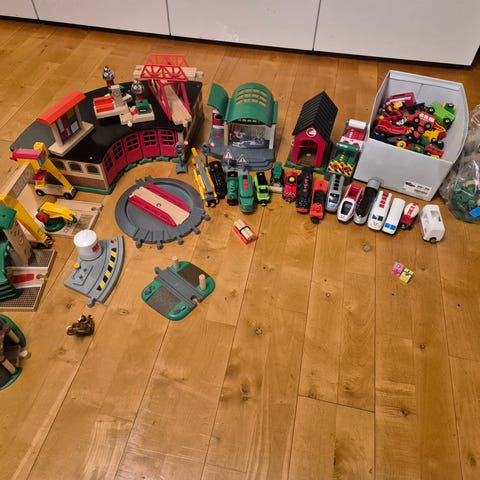 Der er 77 stykker hvor der kan køres på og diverse tog/biler og andre pynte genstande. Sælges samlet og kan sendes forsvarligt på købers regning, eller afhentes i Højer.