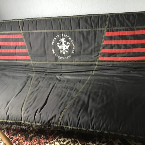 Futon sovesofa med metal stel. Er primært blevet brugt som seng men kan også bruges både som sofa. Ekstra tyk madras, hvor man ligger fantastisk. Stellet giver mulighed for trinvis at hæve den øverste del til brug ved læsning eller tv