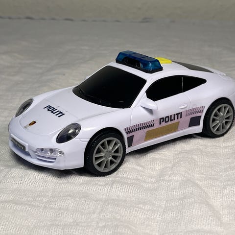 Der er kommet 2 nye AA batterier i Politibilen så den er klar til udrykning med lyd og blink når man trykker på den gule knap på taget.