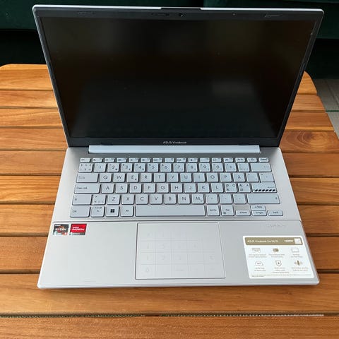 Asus VivoBook bærbar computer med 15,6" skærm. Modellen har fuldt tastatur med numerisk del og stort touchpad. Kabinettet er i sølvfarvet finish indvendigt og mørk yderside med Asus-logo på låget.