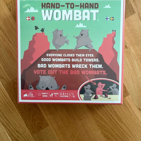 Hand-to-Hand Wombat brætspil for 3-6 spillere fra 7 år. Spillet går ud på, at spillerne med lukkede øjne samarbejder om at bygge tårne, mens hemmelige sabotører forsøger at ødelægge dem. Efter hver runde stemmer spillerne om, hvem de tror er de dårlige wombats. Spillet er velegnet som selskabsspil og partyspil og kan spilles af både børn og voksne i mindre grupper.