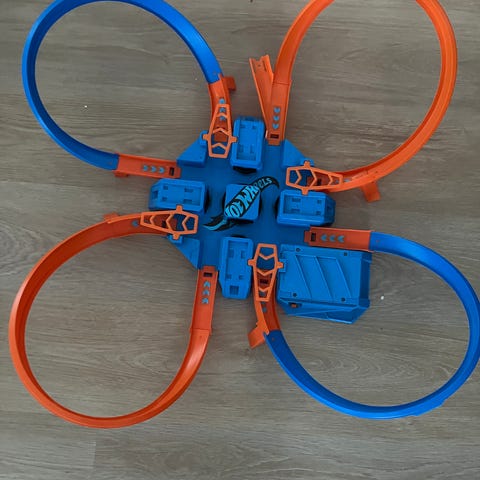 Hot Wheels Criss Cross Crash banesæt (model DTN42). Indeholder bane med hårnålesving og loops. Bruger batterier, da bilerne bliver skudt afsted med høj fart for at kunne komme hele vejen rundt i de 4 loops.
