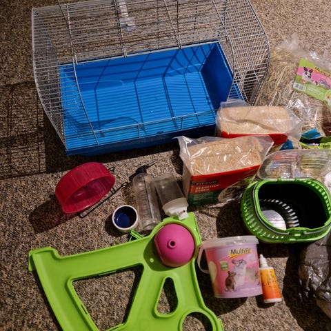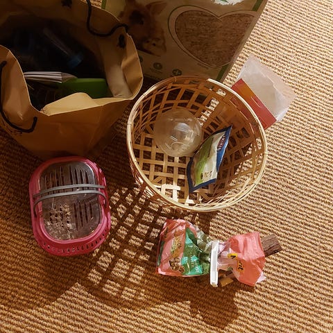 Desuden medfølger en halv pose strøelse samt hamsterbold og fletbold med bjælde indeni der kan bruges, når hamsteren skal have motion.
