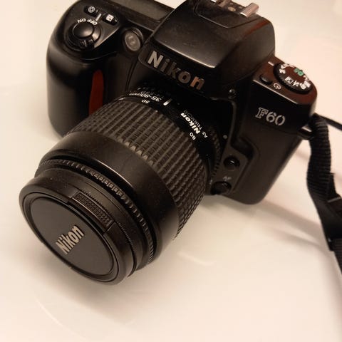 Fra en samling sælges et Nikon F60 analog spejlreflekskamera til 35mm film med zoom objektiv.