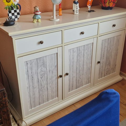 Robust skænk i hvid med flere skuffer og låger. Møblet har tre øverste skuffer samt fire skuffer i den ene side og to skabslåger med indsat felter i trælook. Skænken står på en sokkel og har runde metalgreb. Velegnet til opbevaring i stue, spisestue eller entré, hvor der er behov for ekstra plads til service, tekstiler eller andre genstande.